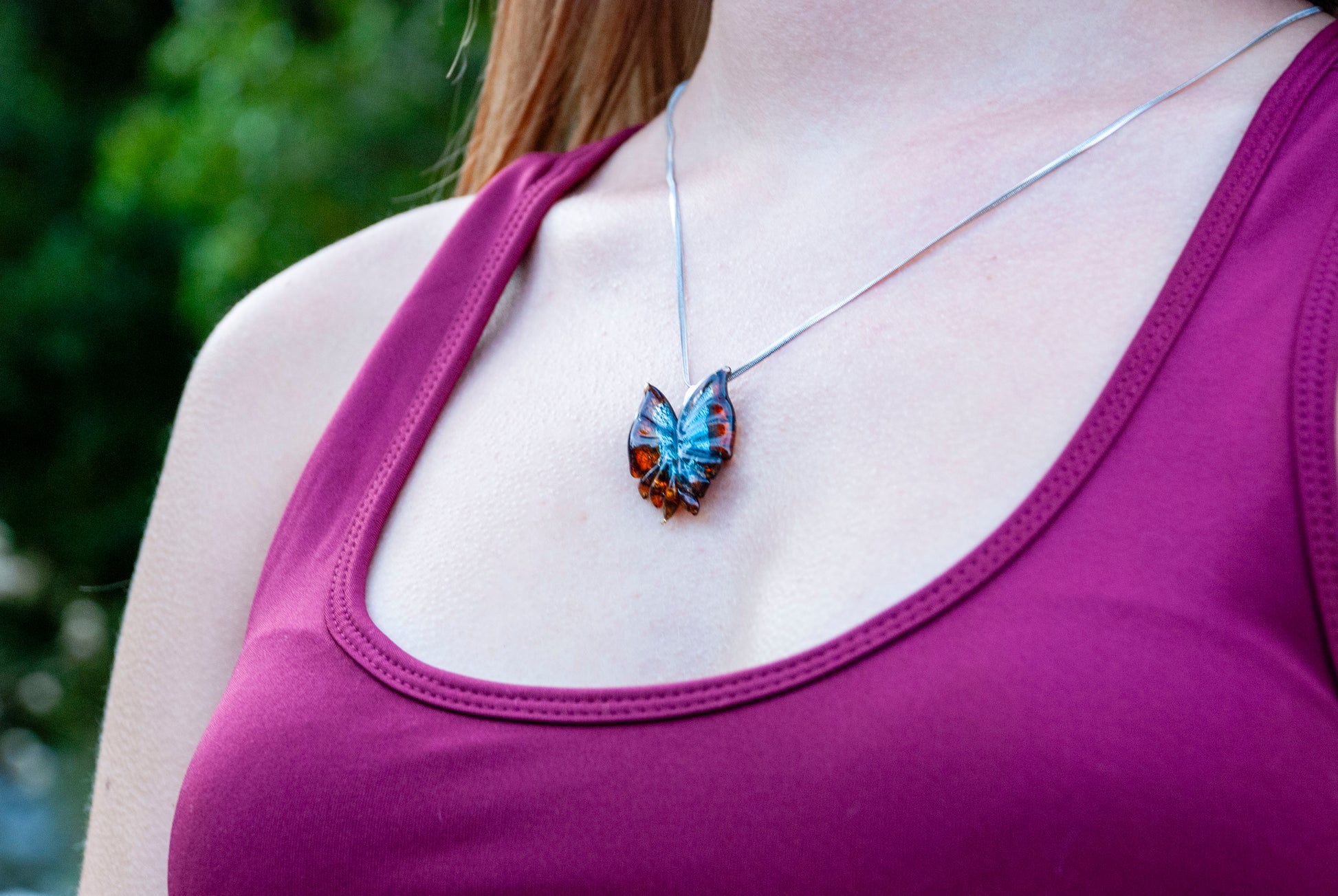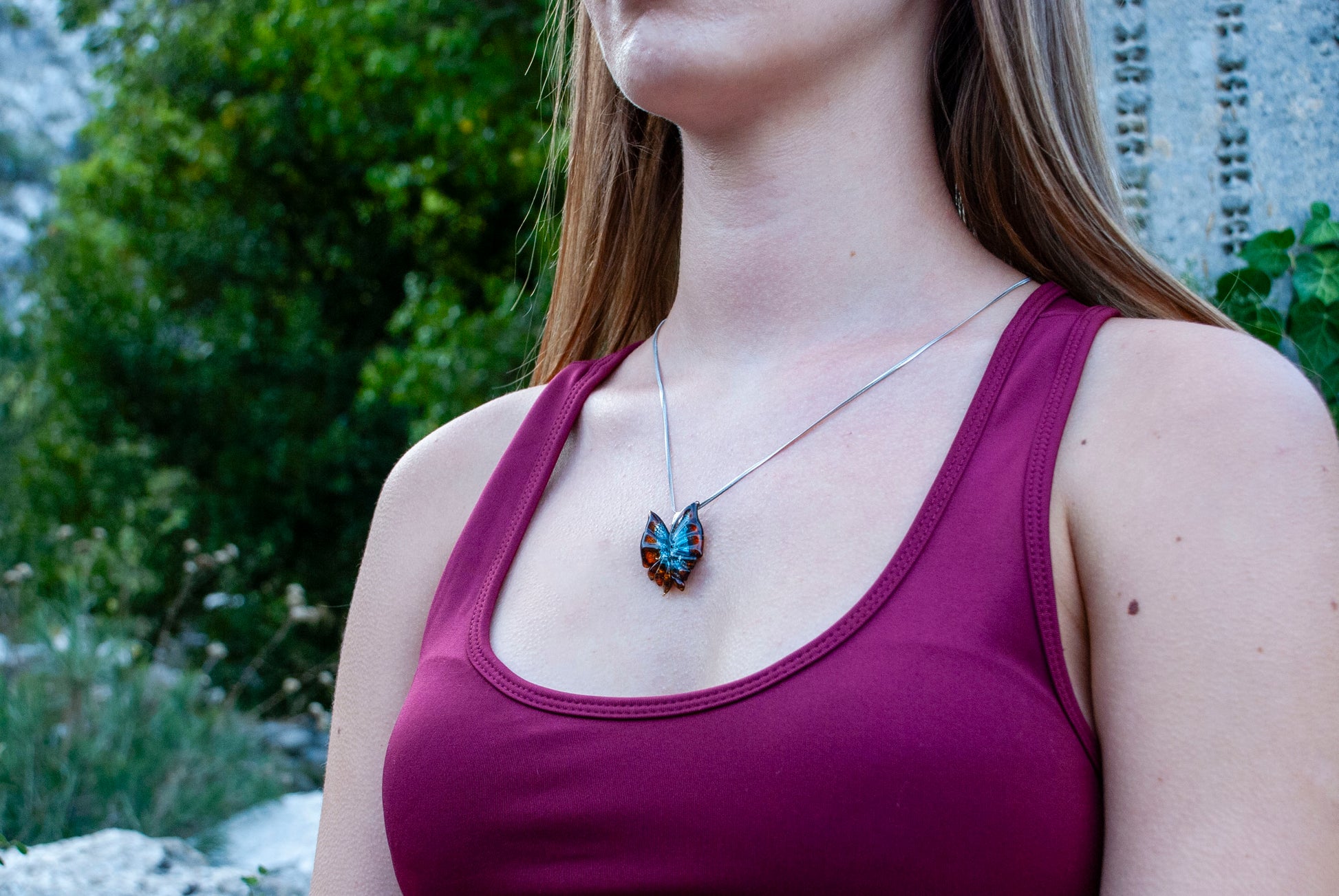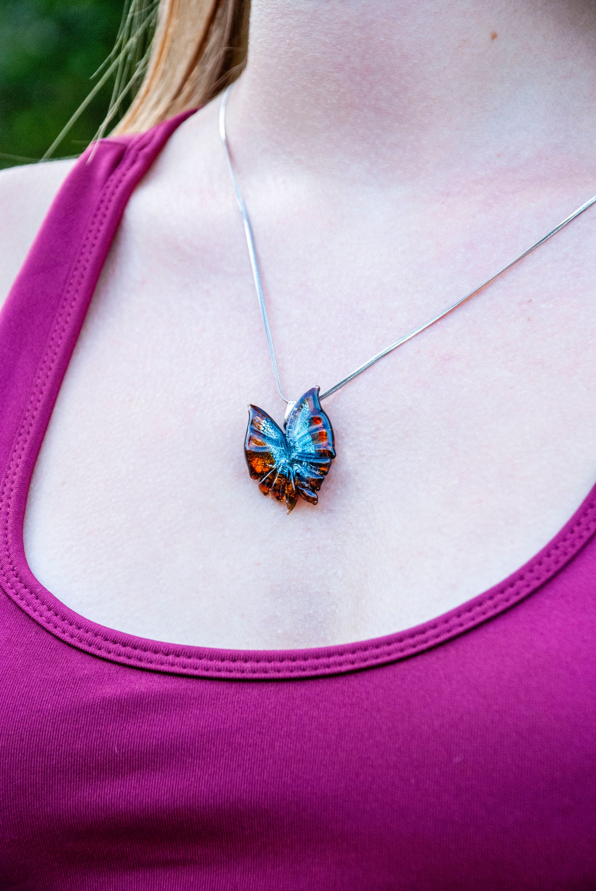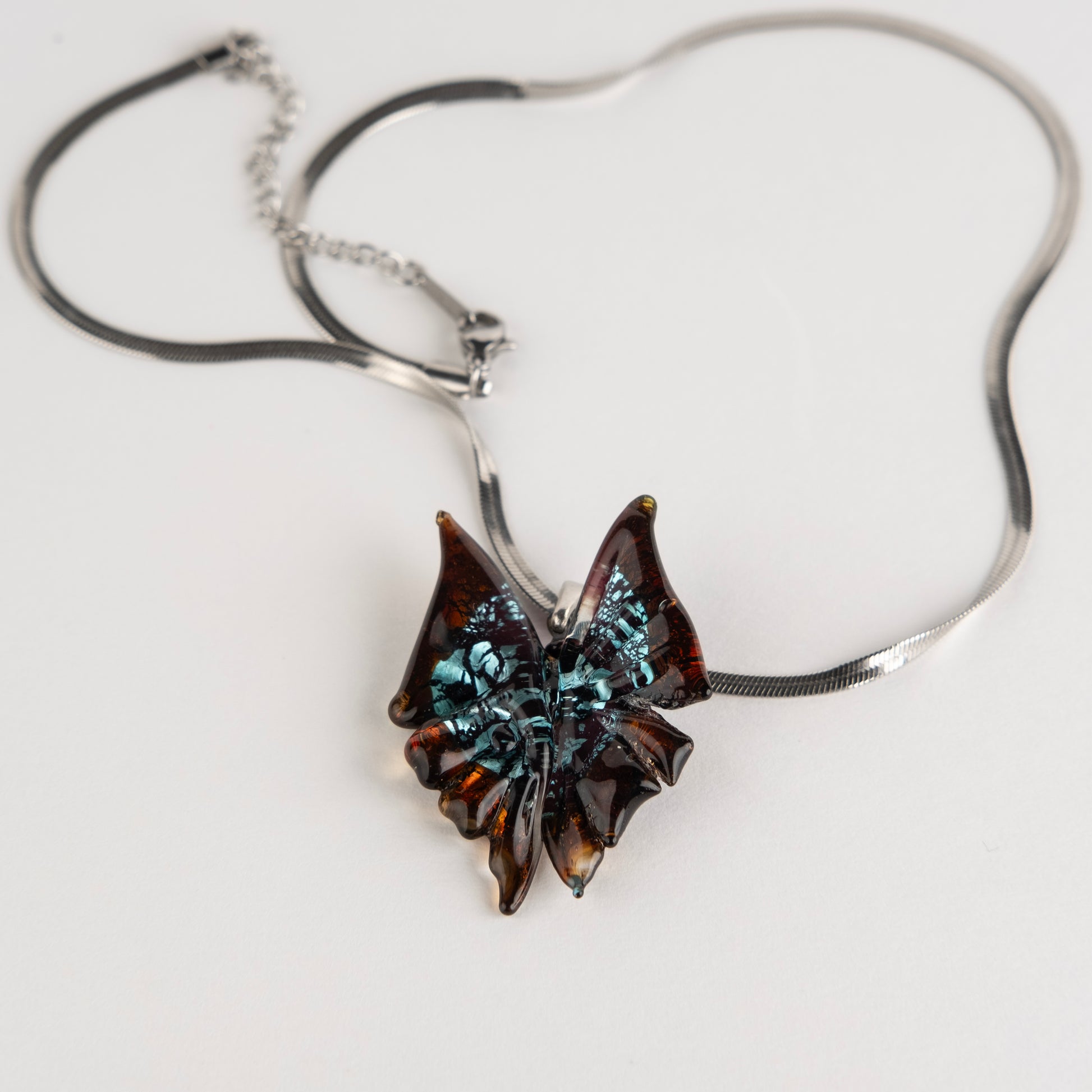 Murano camı. Gümüş ve altın. Paslanmaz hipoalerjenik çelik zincir.